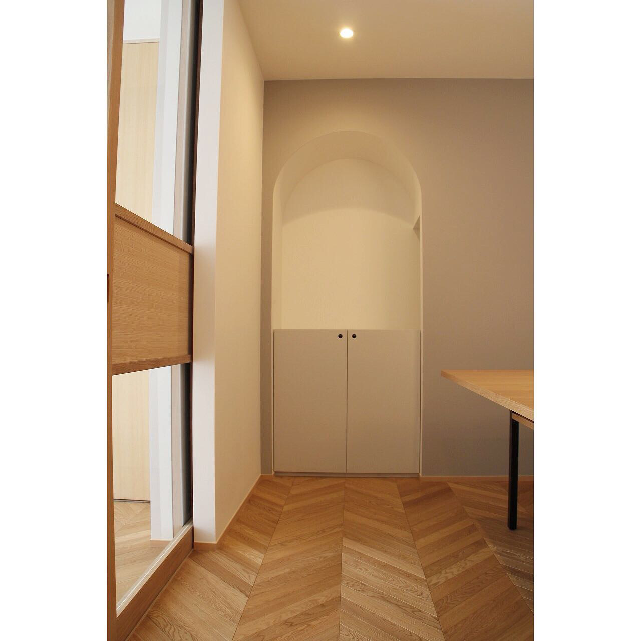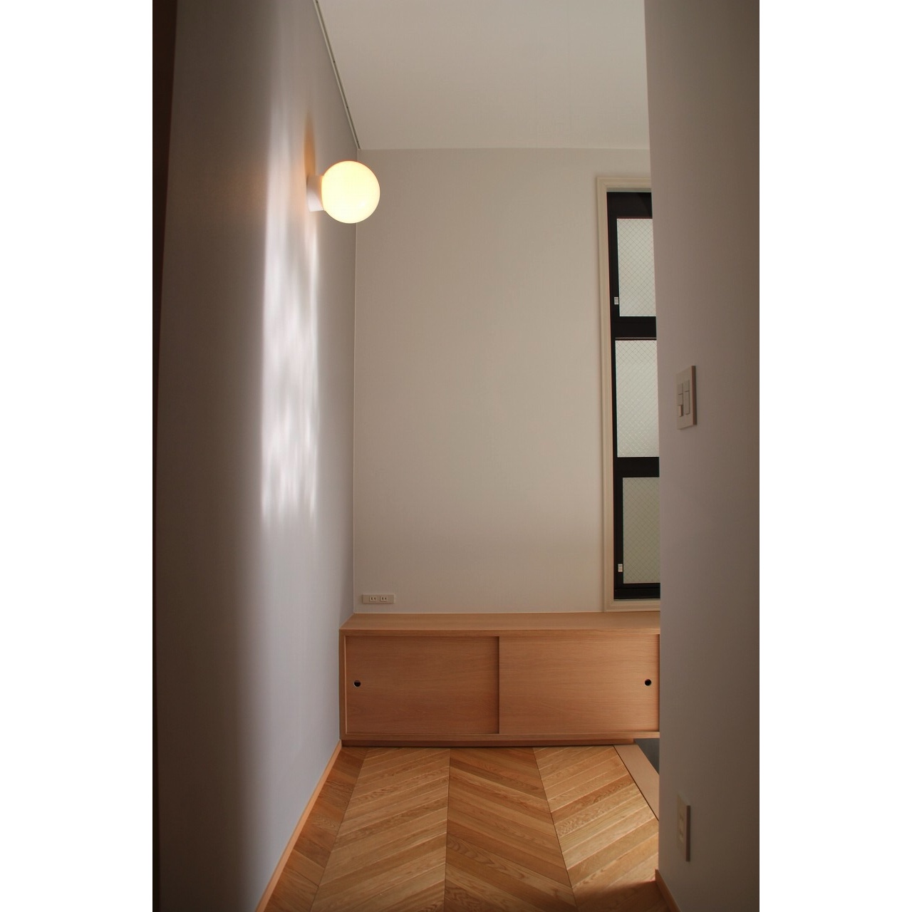 玄関から入って廊下を挟んだ、かつて和室だった室側の壁をとり、必要な柱はサッシの方立に見えるようにし、3枚の木製ガラス壁で閉塞感と暗さを和らげた。既存の床はできる範囲で撤去せず上から新たな床を貼ったり、既存の造作食器棚など使えるものは箱を残し、前板と取っ手をかえるだけなどでコストダウンを図った。
