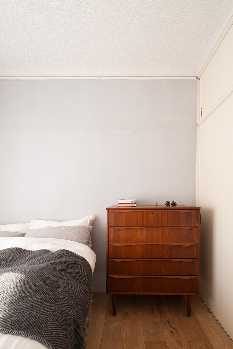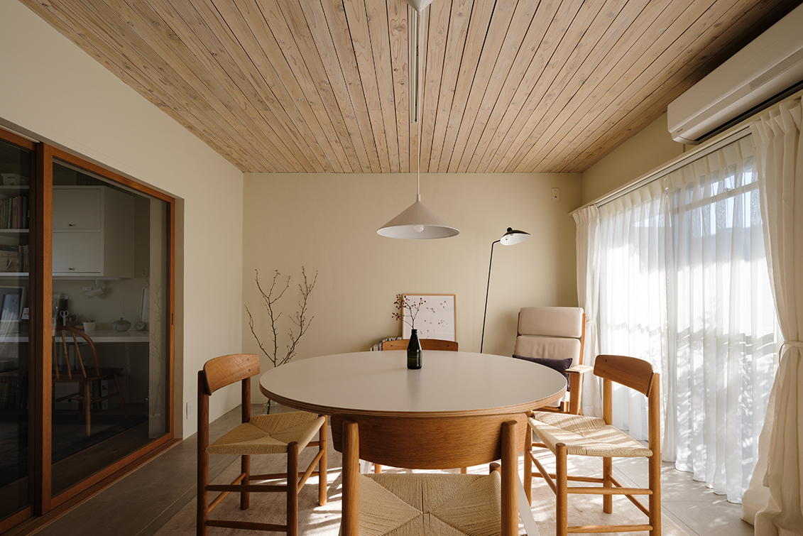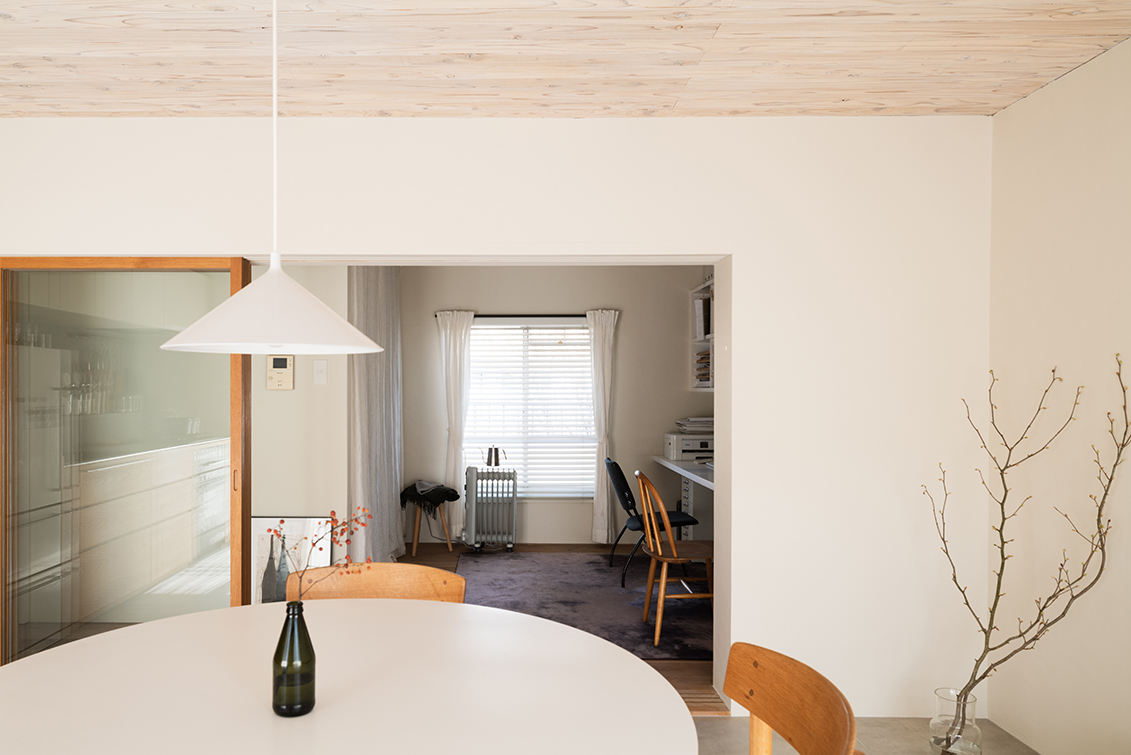 真南かつ十分な間隔で配棟された高台に建つこの4層の建物は、真冬はたっぷりと日が降り注ぎ、日中はとても暖かい。日射による蓄熱効果に期待し、DKはタイルを敷き込んだ。北側の1室とDKの壁を躯体ギリギリまで取り払い、木製の3枚のガラス引戸でゆるく間仕切れるようにした。これにより南北に正対した窓から光と風が効率よく取り込まれ、室全体の快適性が向上した。あえてワンルームにしなかったことで仕事とプライベートのオンオフの切り替えがうまくでき、また空調効率という点でも、この3枚のガラス扉が思っていた以上に有効であった。