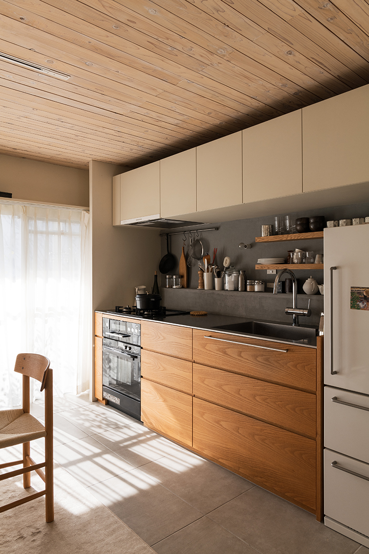 キッチンは、前職から長年お世話になっているフリーハンドイマイさんに依頼し、細かい部分まですべてオーダーで製作した。家具といえどもキッチンは特殊で、使い勝手やメンテナンス性が重要である。イマイさんはこだわりの多い施主のキッチンの製作を数多く手掛けられているため、知識が多様かつ豊富で、また様々なメーカーの機器類の情報も常にアップグレードされていて、いつも非常に頼りにしている。