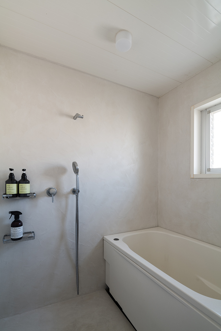 お風呂は前居住者が、いわゆるハーフユニットバス(壁天井、浴槽のみユニットバス)に改修していたが、浴槽と壁を取り払い、床壁共にモールテックスの塗装で仕上げ、設備機器類を一新した。