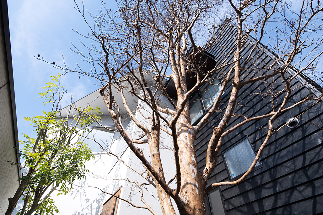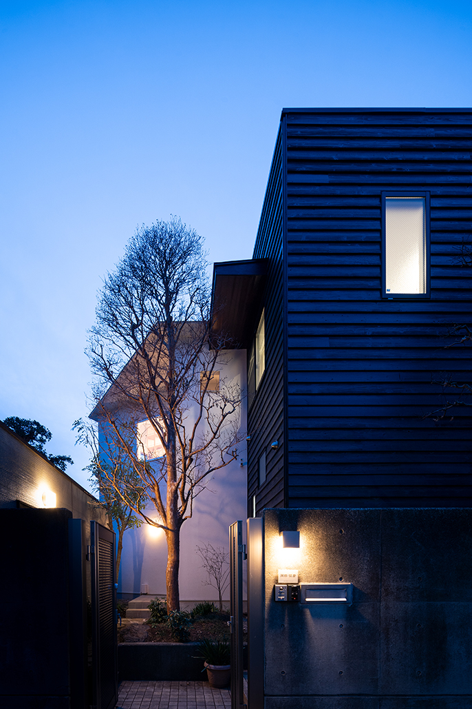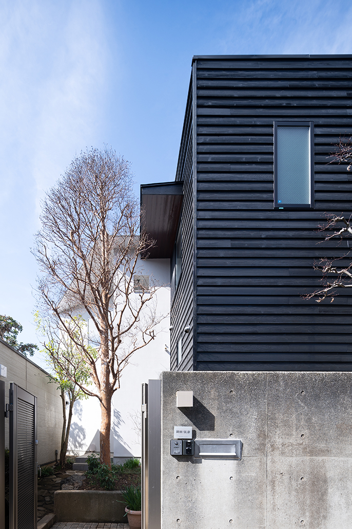 築40年弱の既存の家は、建築家であった親族が設計したもので、木造でありながらパラペットを立ち上げた軒のない箱型の外観は、当時からするとモダンな作りで、杉の下見板張りが目を引く魅力的な建物であった。二世帯仕様にするためにはスペース的に増築が避けられず、この雰囲気をできるだけ残しながらどのような形状・仕様で増床するかのスタディーを繰り返した。