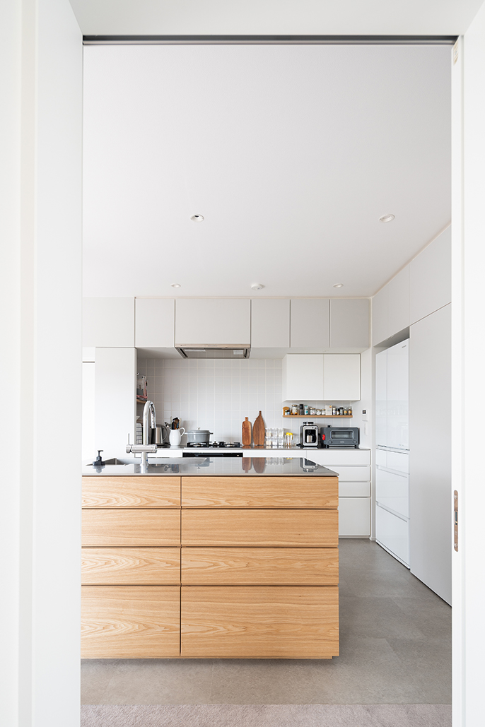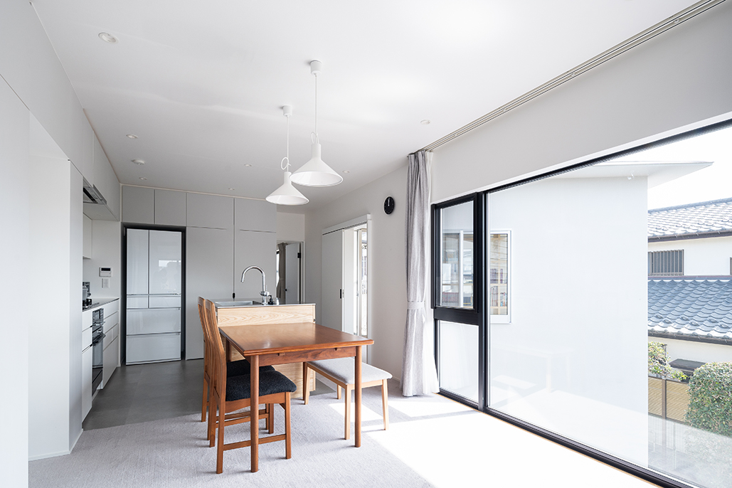 構造は既存の骨組みを活かしつつ、一部梁や柱の補強を行った。外壁・屋根はすべて一旦取り払い、外壁の下地だけ準防火仕様(新築時は防火地域外)に変え、既存の下見板は可能なものはできるだけ残し再利用した。階段室として増築した部分は白い寄棟の屋根と白い吹付の外壁とし、あえて既存部分とデザインを切り離した。2階リビングからの開けた眺望を楽しめるように開口部を大きくとり、造作家具で収納やキッチンを一体的にデザインし、明るく居心地の良い空間とした。